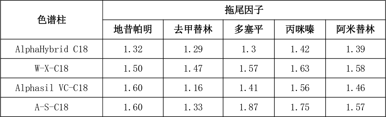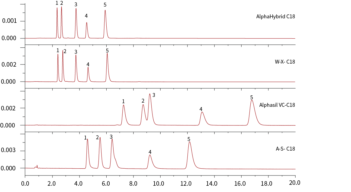 雜化硅膠色譜柱在合成過程中減少了硅醇基的數(shù)量,從而降低了其酸性,減少了與堿性化合物的離子交換作用,從5種堿性化合物的分析結(jié)果分析,AlphaHybrid C18改善了堿性化合物的峰形和分離效果。