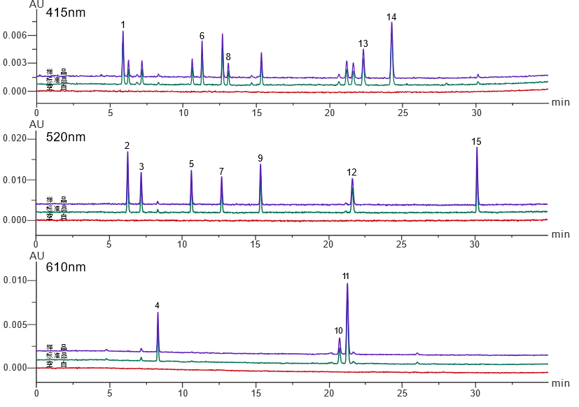 檢測物質:1.檸檬黃,2.新紅,3.莧菜紅,4.靛藍,5.胭脂紅,6.喹啉黃1,7.日落黃,8.喹啉黃2,9.誘惑紅,10.亮藍1,11.亮藍2,12.酸性紅,13.喹啉黃3,14.喹啉黃4,15.赤蘚紅