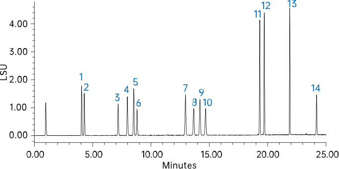 Alphasil Xaqua C18牛黃專用柱在膽酸類化合物分離應用中,展現出可靠的分離性能,14種膽酸類化合物均呈現清晰的色譜峰和良好的分離度,為相關分析工作提供了穩定的技術支持。