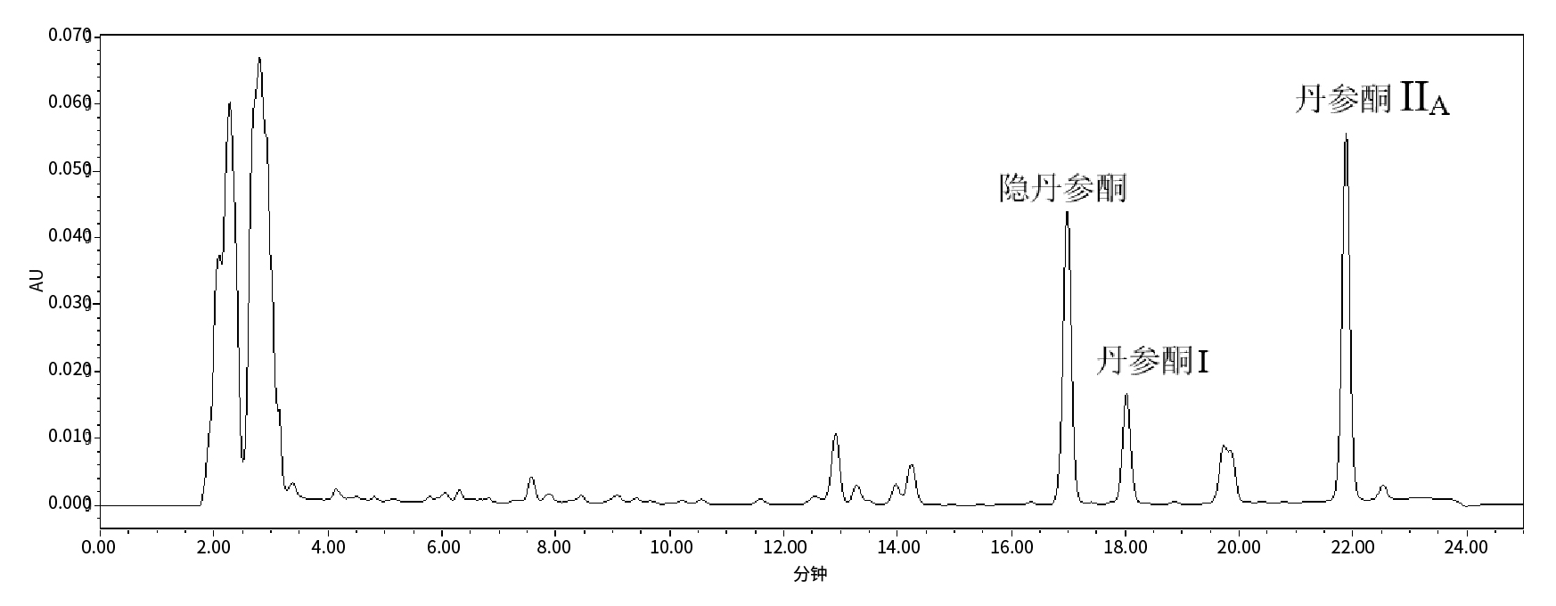本文參照2020版《中國藥典》,采用全多孔色譜柱Alphasil VC-C18,對丹參供試品進(jìn)行分析,結(jié)果顯示,丹參中目標(biāo)峰峰形良好,隱丹參酮、丹參酮I的相對保留時(shí)間分別為0.78和0.82,丹參酮ⅡA峰目標(biāo)峰理論塔板數(shù)大于60000,符合《中國藥典》要求。本方案可為丹參中丹參酮類的測定提供參考。