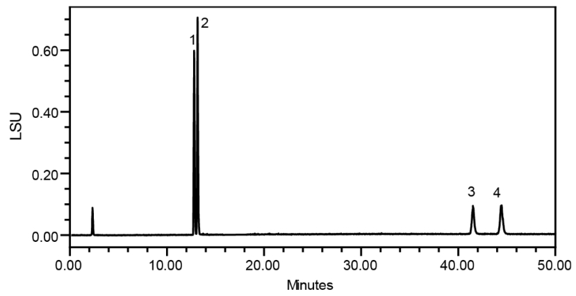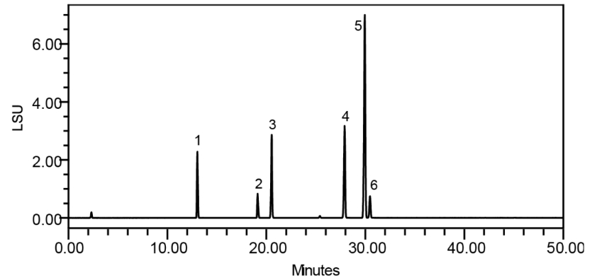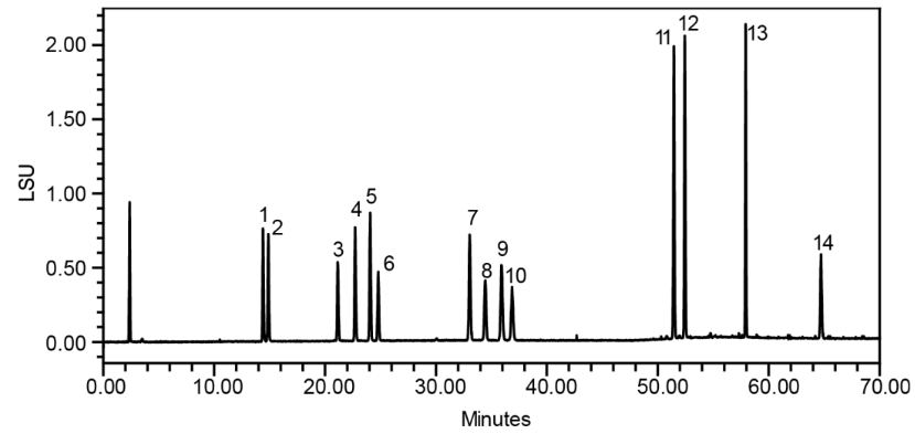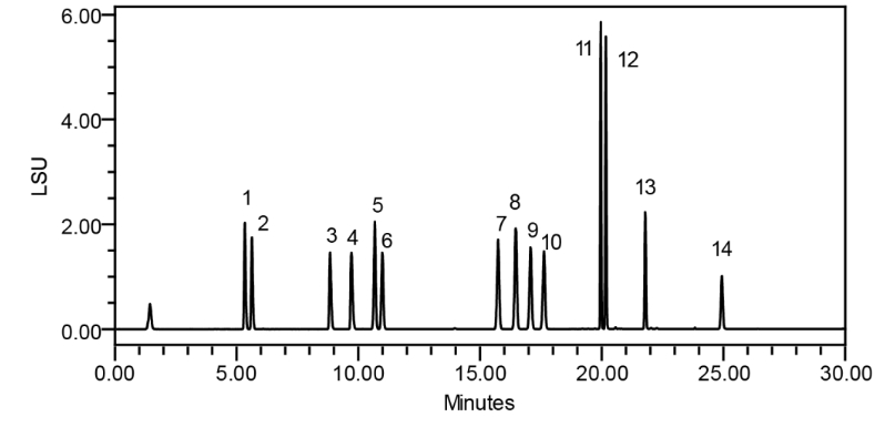 Alphasil ACCHROM Xaqua C18牛黃專用柱不僅可以達(dá)到公示稿中含量測定要求,通過優(yōu)化標(biāo)準(zhǔn)方法,也可以用于藥材的鑒別,能夠同時分離14種膽酸類化合物,并展現(xiàn)出良好的分離選擇性、理想的峰形和分離度。