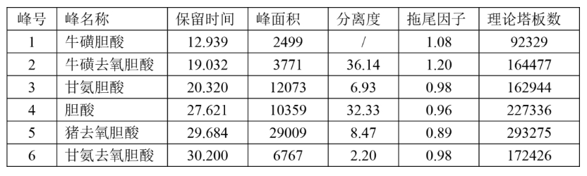 · 理論塔板數(shù)高于10000(以牛磺膽酸峰計),符合要求。