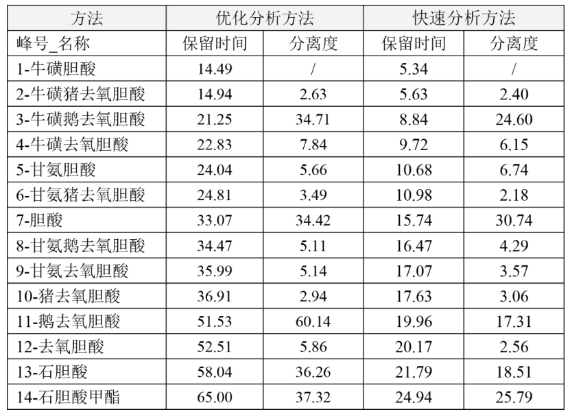 當(dāng)更關(guān)注分析效率時,3.5μm的Alphasil ACCHROM Xaqua C18牛黃專用柱可將14種膽酸類化合物的分析時間縮短60%,同時能保證各組分之間的分離度,大大提高了樣品的分析通量。