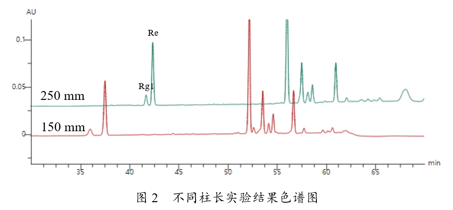 本文對色譜柱長度進行了考察,結果發現了一個有趣的現象,150mm色譜柱Rg1和Re分離效果優于250mm的色譜柱,如圖2所示。這個結果與我們過往經驗相悖,即相同條件下,色譜柱越長,化合物分離度應該越好。